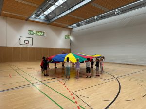 Nach dieser Stärkung ging es ab in die Turnhalle zum Sportunterricht. Aber erstmal mussten wir zu den Umkleidekabinen laufen. Man war der Weg weit. Wir mussten durch viele Türen und einen kleinen „Tunnel“ bis wir dann endlich angekommen sind. Noch schnell umziehen und schon standen wir in der großen Turnhalle. Und obwohl sie durch eine Trennwand verkleinert war, kam sie uns riesig vor. Nach ein paar Spielen mit dem Schwungtuch folgte zum Abschluss noch das beliebte Spiel „Feuer, Wasser, Sturm“. Im Gegensatz zu unserer Turnhalle in der Kita war hier so richtig viel Platz zum Rennen, was die Kinder sichtlich genossen.