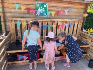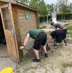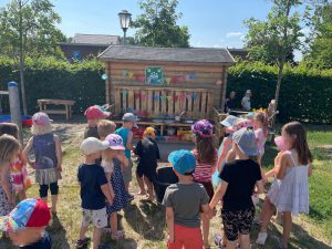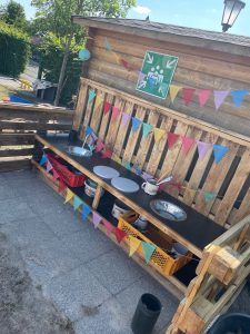 Die Erzieher bereiteten gemeinsam mit dem Hausmeister den Untergrund vor und die neue Matschküche fand einen tollen Platz in unserem Kitagarten. Die großartigen Temperaturen lassen die Küche nicht kalt werden.