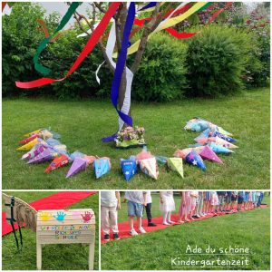 Dieses Jahr trafen sich die Eltern erstmals schon im Juni zum gemeinsamen Basteln der Zuckertüten für ihr Kind. Wunderschöne und sehr individuelle Exemplare entstanden und konnten nun befüllt werden. Die Kinder erstellten mit den Erzieherinnen eine Wunschliste für das Buffet und hängten diese für die Eltern aus. Nun begann das große Einüben des Programms. Fleißig wurden Gedichte, Lieder, Tänze und Zungenbrecher geübt.