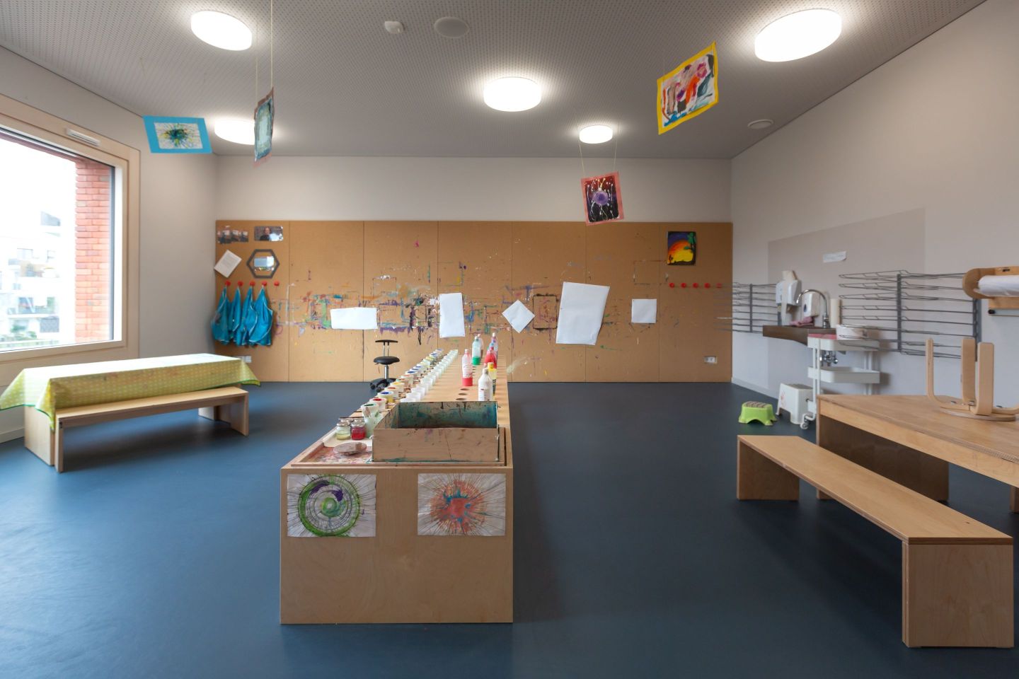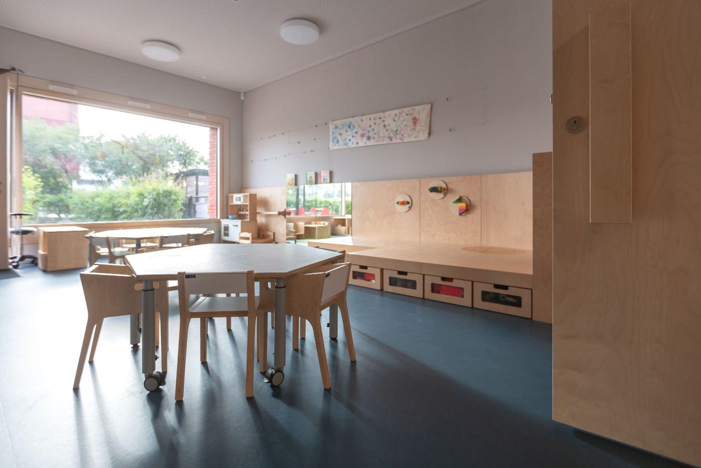 Im Bereich Kindergarten (Ü3) stehen zunächst die Struktur (Zuordnung zu sog. Farbbereichen mit Bezugserzieher*Innen) und Orientierung im Haus, im Bereich Kiga, im Farbbereich im Kontext offener Möglichkeiten für die Kinder im Fokus. Inhaltliche Bestandteile sind sowohl Morgenkreise der Farbbereiche, „Wackelzahnarbeit“ (vorschulische Bildungsarbeit), Sprachbildung, das freie Spiel in den Funktionsräumen als auch gemeinsame Aktionen, Feste… Didaktische Schwerpunkte sind die Inhalte der einzelnen elementaren Bildungsbereiche.