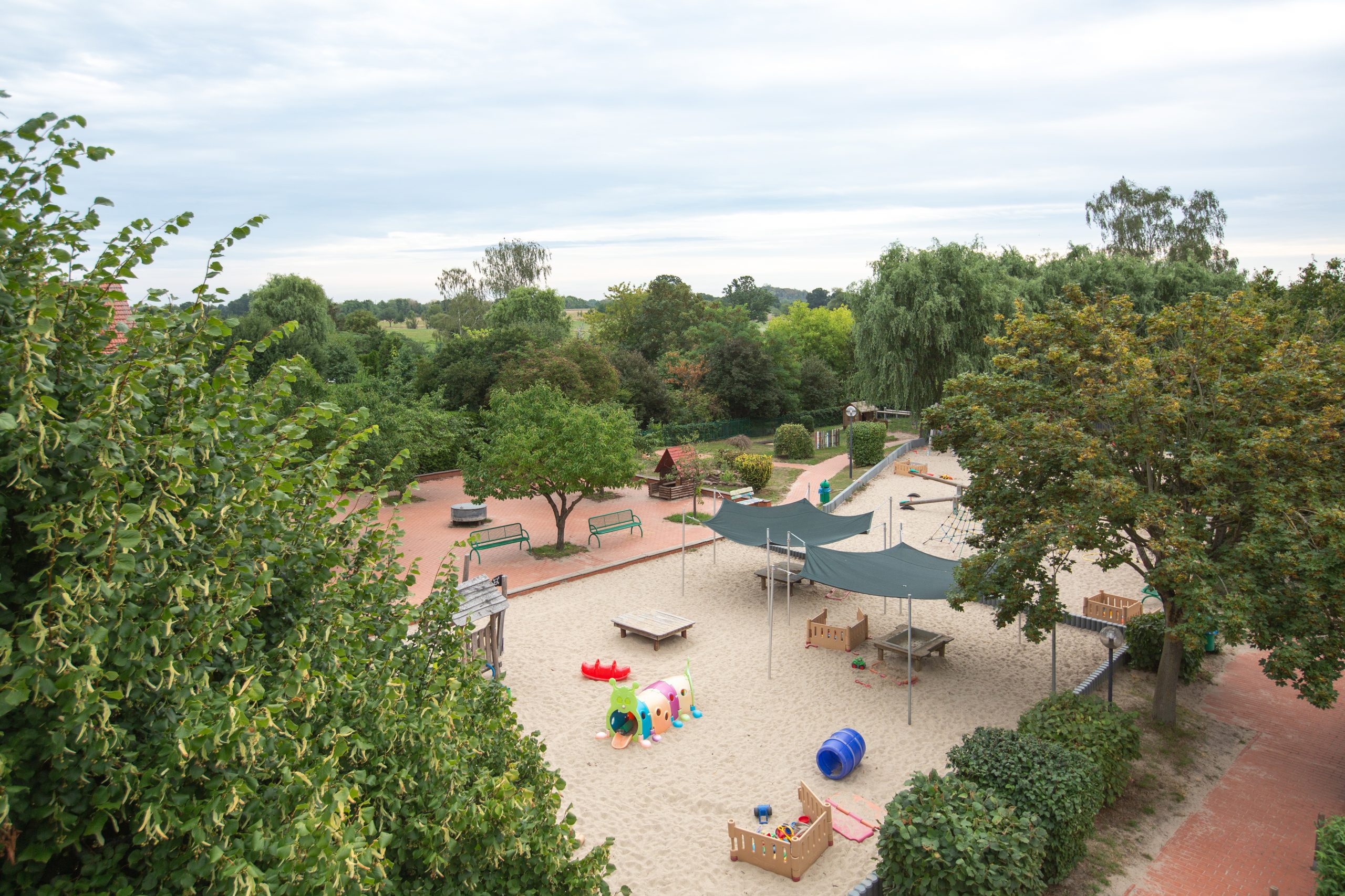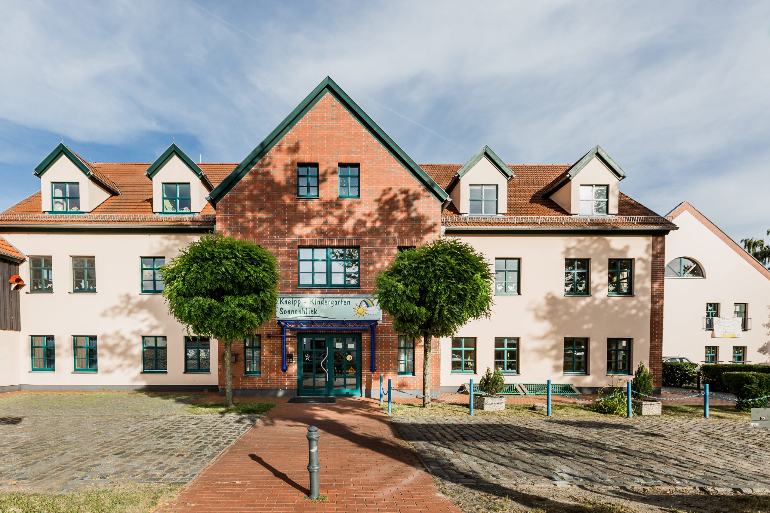Die Kita „Sonnenblick“ besteht aus 2 Häusern für jeweils die Bereiche Krippe und Kiga. Sie verfügt über ein großzügiges Außengelände mit großem Spielbereich, einem Sportplatz sowie einem Kneipp Garten und einen wunderbaren rückwärtigen Blick auf Wiese und Feld. Dem Namen „Sonnenblick“ ganz verpflichtend mit zum Teil ganz zauberhaften Sonnenaufgängen.