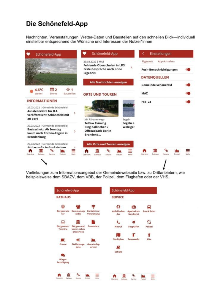 Abgelehnt wird von vielen die Verlinkung auf Zeitungsartikel, die mit einer Bezahlschranke versehen sind, und von den App-Nutzer*innen ohne Abonnement nicht gelesen werden können. Darauf hat die Gemeindeverwaltung jedoch keinen Einfluss bzw. ist es nicht möglich, zwischen kostenlosen und kostenpflichtigen Artikeln zu unterscheiden. Nutzer*innen der App haben aber selbst die Möglichkeit, in den App-Einstellungen die MAZ oder andere Nachrichtenquellen auszublenden (Menü am unteren App-Rand – Button „Mehr“ anklicken – dann in den „App-Einstellungen“ die gewünschten Datenquellen ein- oder ausschalten). Auch die Funktion der Push-Benachrichtigung für besondere Eilmeldungen lässt sich hier aktivieren. Notwendig ist hierzu auch, in den Einstellungen des eigenen Mobilgeräts die Schönefeld-App aufzurufen und die Benachrichtigung über die App zuzulassen, sonst funktioniert die Push-Benachrichtigung nicht, auch wenn sie in der App selbst aktiviert ist.