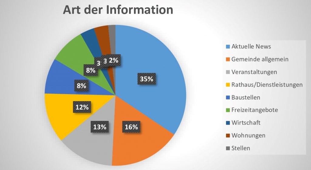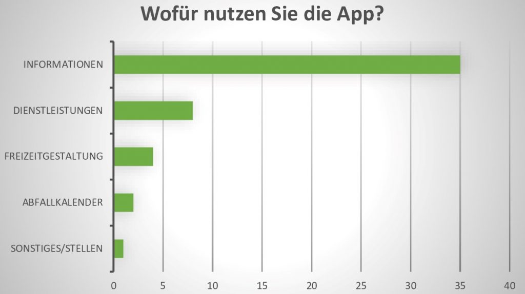 Noch einmal konkreter gefragt nach der Art der Information, die die User*innen in der App suchen oder erwarten, gab mehr als ein Drittel und damit die deutliche Mehrheit der Umfrageteilnehmenden an, dass für sie die Information über aktuelle Nachrichten bei der Nutzung der App im Vordergrund steht. 16 Prozent suchen Informationen über die Gemeinde im Allgemeinen, während sich rund 12 Prozent über Dienstleistungen informieren. Veranstaltungen und Freizeitangebote werden von rund 20 Prozent der Teilnehmenden über die App gesucht, wobei die Veranstaltungstipps hier dominieren. Eine etwas nachrangige Bedeutung haben Wirtschaftsthemen und das Karriereportal. Unter den in der App integrierten Servicelinks, zu denen auch Notdienste und Routenplaner gehören, wurde lediglich der Abfallkalender von den Umfrageteilnehmenden als für sie relevant genannt.
