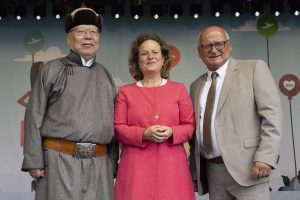 Um 14 Uhr eröffneten Christian Hentschel und Aletta von Massenbach das gemeinsame Fest. Anlässlich des 25-jährigen Jubiläums der Partnerschaft der Gemeinde mit dem mongolischen Destrikt Bayangol der Stadt Ulaanbaatar sprach der Botschafter der Mongolei in Deutschland, Herr Birvaa Mandakhbileg ebenfalls ein Grußwort. Foto: P. Becerra/