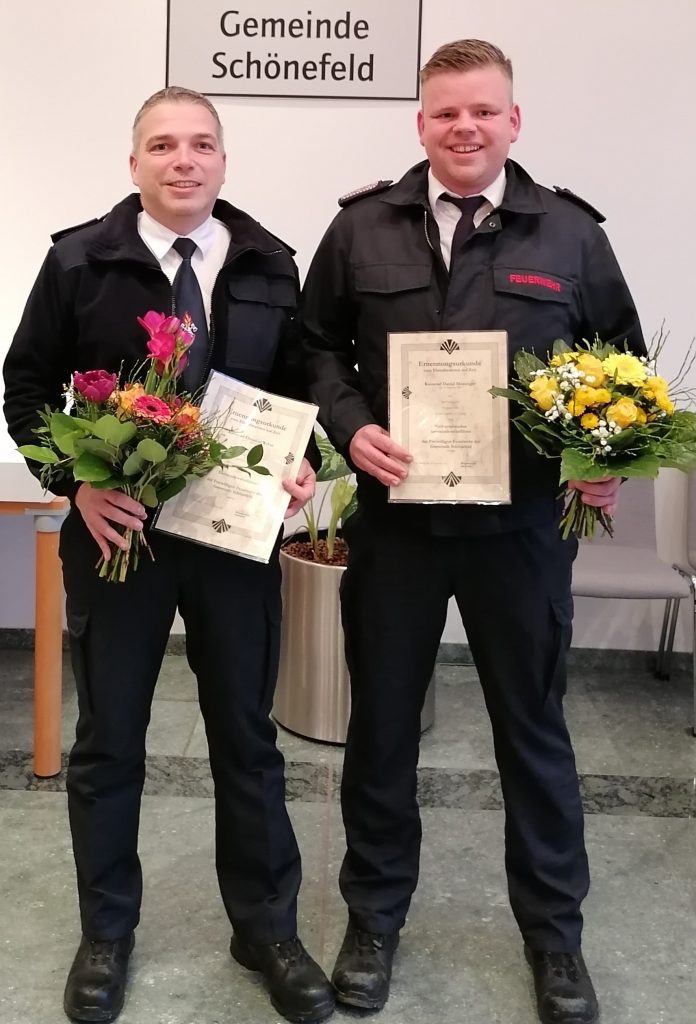 Christian Weber und Daniel Messinger werden für weitere sechs Jahre das Führungsduo der Freiwilligen Feuerwehr der Gemeinde Schönefeld bilden.