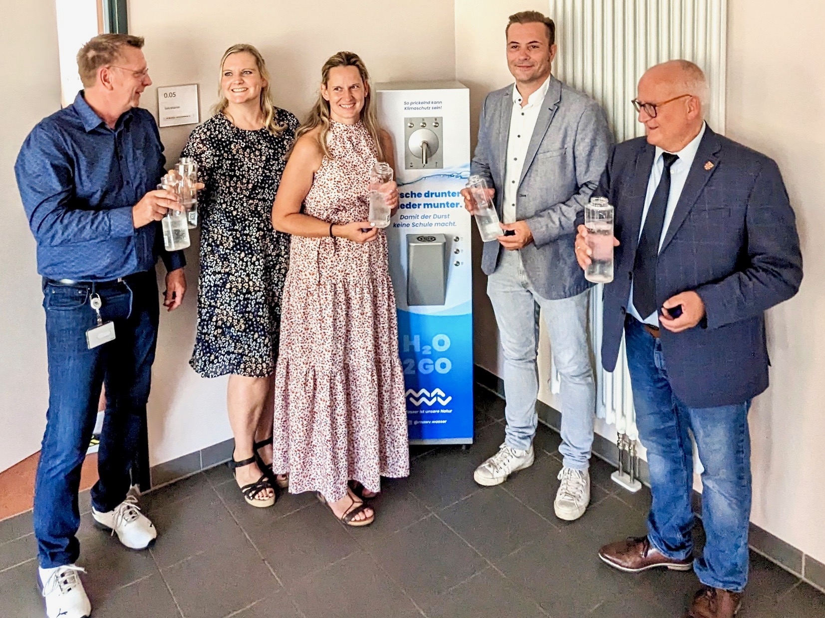 Herr Carouge von den Berliner Wasserbetrieben, Schulleiterin Frau Möhr, Frau Greif von der Gemeinde, Herr Börnecke vom Märkischen Abwasser- und Wasserzweckverband (MAWV) und Bürgermeister Christian Hentschel freuen sich, dass es nun endlich soweit ist und die Schüler*innen ihre Flaschen mehrmals täglich mit frischem Wasser (Still, Medium, Sprudel) auffüllen können.