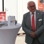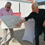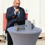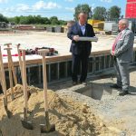 Nach kurzen einführenden Worten ließen Dahme-Spreewalds Landrat, Sven Herzberger, und Schönefelds Bürgermeister, Christian Hentschel, symbolisch eine Zeitkapsel ins Erdreich nieder, bevor die Baubeteiligten zum Spaten griffen und die mit Geld und Tageszeitung gefüllte Kapsel mit Sand bedeckten.