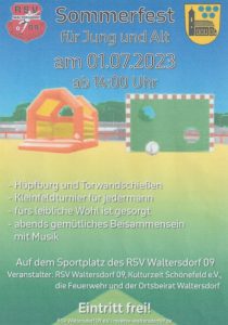 Der RSV Waltersdorf 09, der Verein Kulturzeit Schönefeld sowie die Feuerwehr und der Ortsbeirat Waltersdorf laden Jung und Alt am Samstag, 1. Juli 2023, zu einem Sommerfest auf den Sportplatz des RSV. Los geht’s um 14 Uhr. Es wird ein buntes Programm mit Hüpfburg und Torwandschießen, einem Kleinfeldturnier, Musik und kulinarischen Genüssen geben.